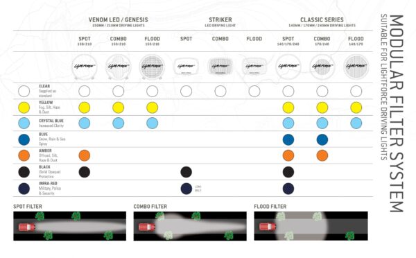 Genuine Lightforce Polycarbonate filters for Genesis 8″, Venom 6″ & Striker 4″x6″ LED Auxiliary Driving Lamps. Available in Clear, Yellow, Black and Crystal Blue. Available Beam patterns are spot, flood and combo. Refer to filter photometric chart in photo gallery for more info. Sold individually. Minimum order is two. Select filter size and colour/beam pattern options from the drop down menu below.
